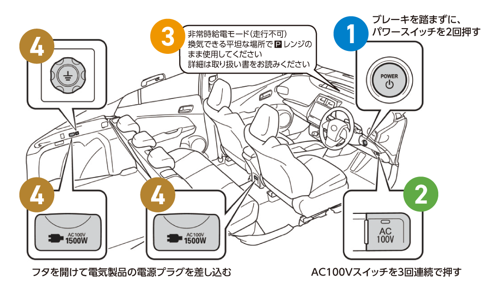 災害などによる非常時に電力が必要なとき、次の方法を行うことで、